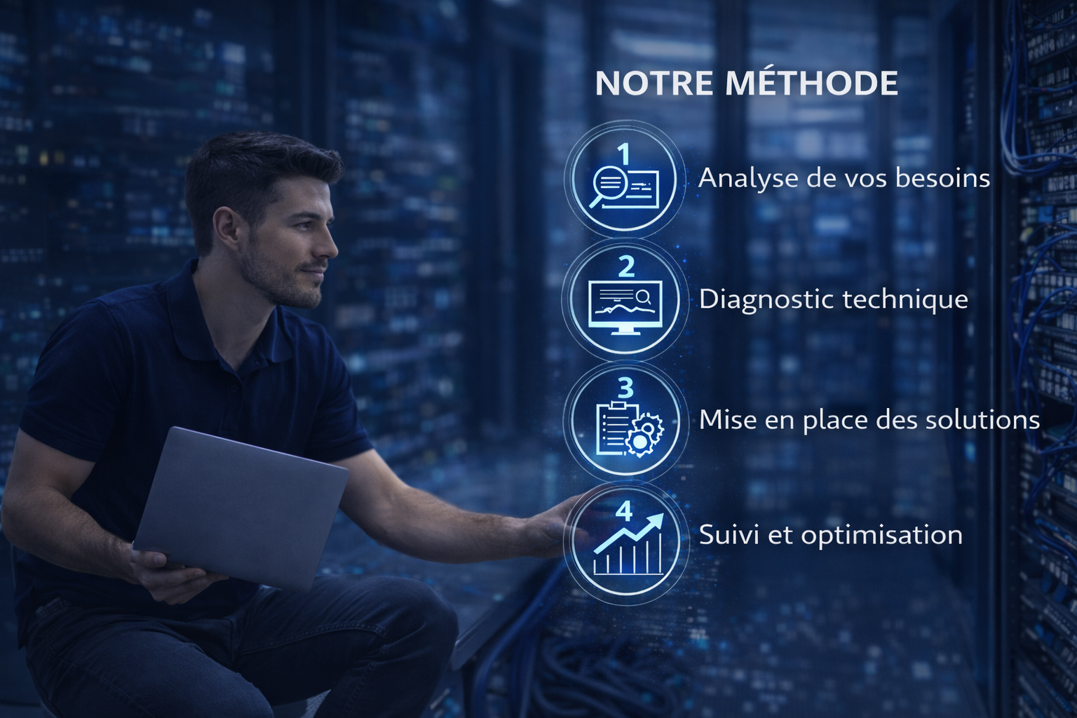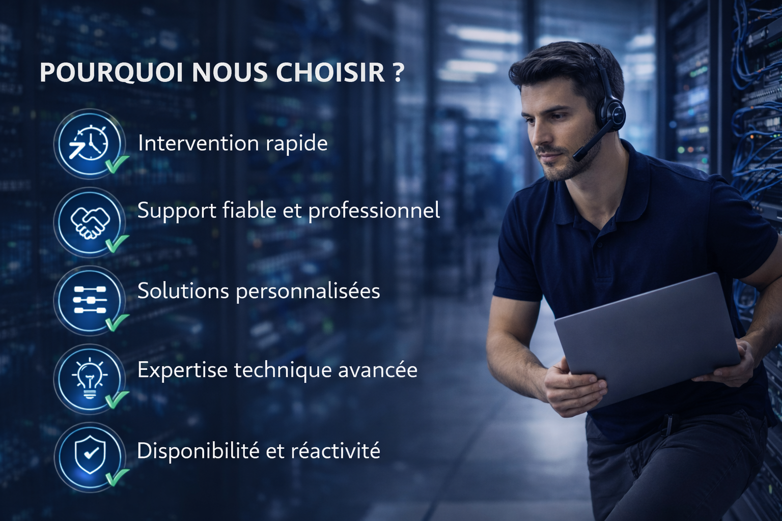 Assistance technique rapide pour résoudre vos incidents, assurer le support utilisateurs et maintenir vos systèmes informatiques performants.